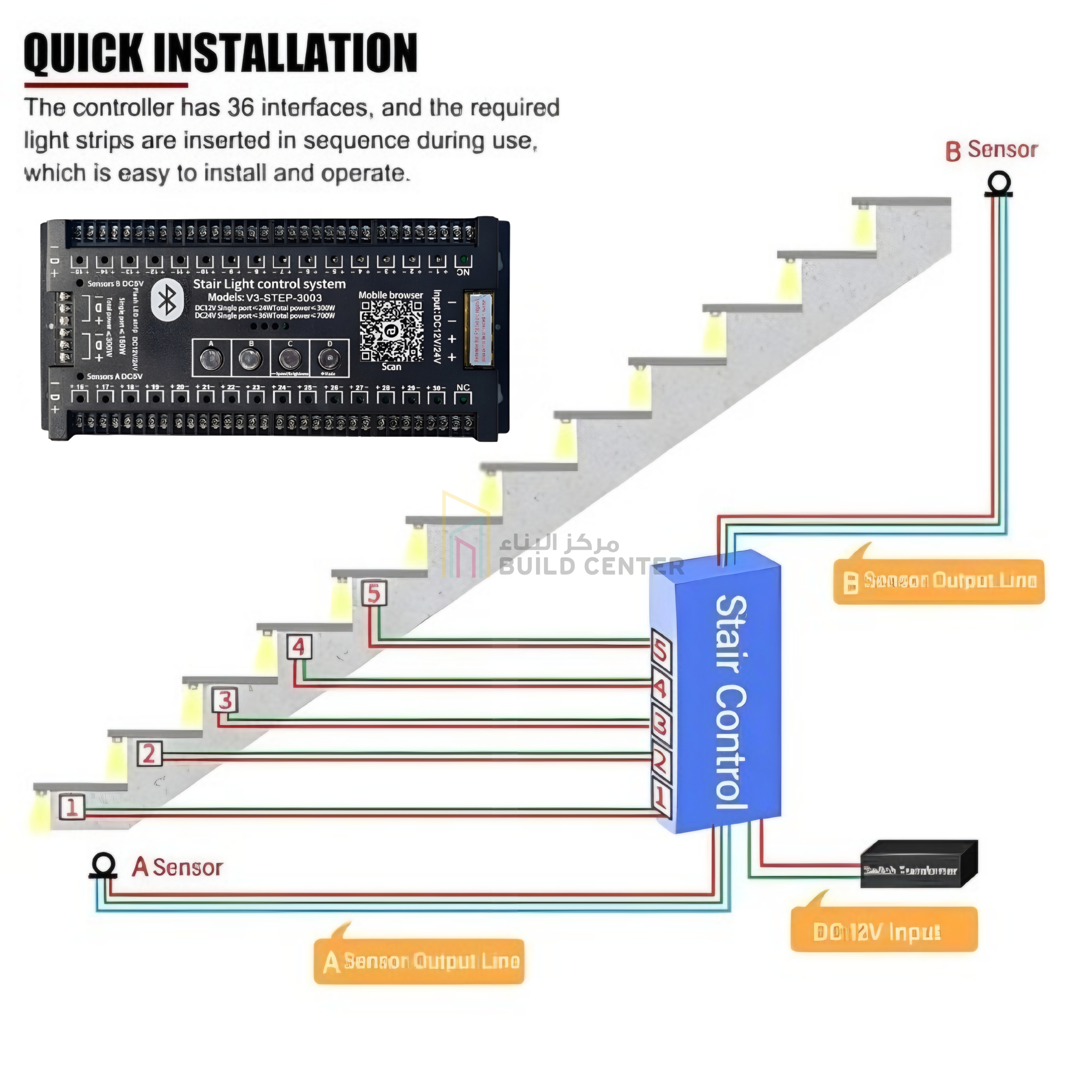 - سهولة التركيب: يتميز الجهاز بسهولة التركيب، مما يجعله مثاليًا لإضافته إلى أنظمة الإضاءة الموجودة في السلالم أو الأماكن الداخلية الأخرى.