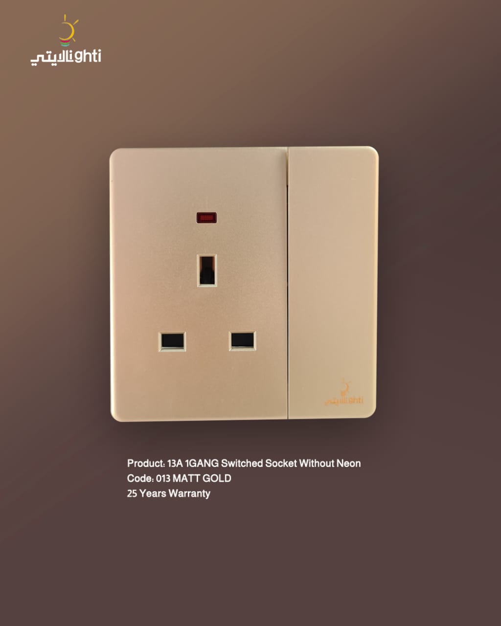 13A 1 Gang Switched Socket Matt Gold هو مقبس كهربائي بقدرة 13 أمبير، يأتي مع مفتاح للتحكم في تشغيل وإيقاف الأجهزة الكهربائية. يتميز بتصميم عصري وأنيق مع لمسة نهائية غير لامعة باللون الذهبي (Matt Gold)، مما يجعله إضافة رائعة لأي مكان يهدف إلى تعزيز الأناقة والرفاهية. إليك تفاصيل هذا المنتج:
