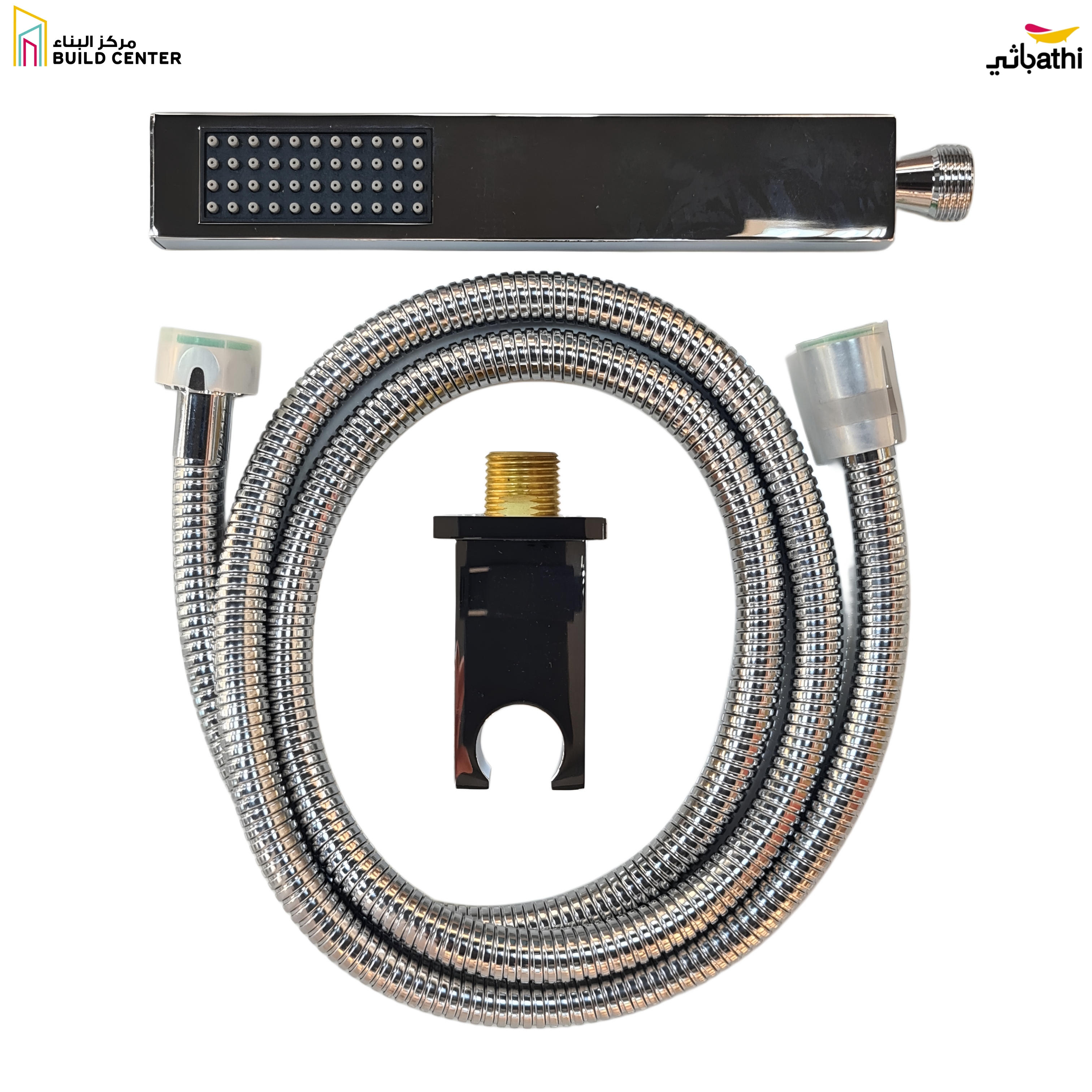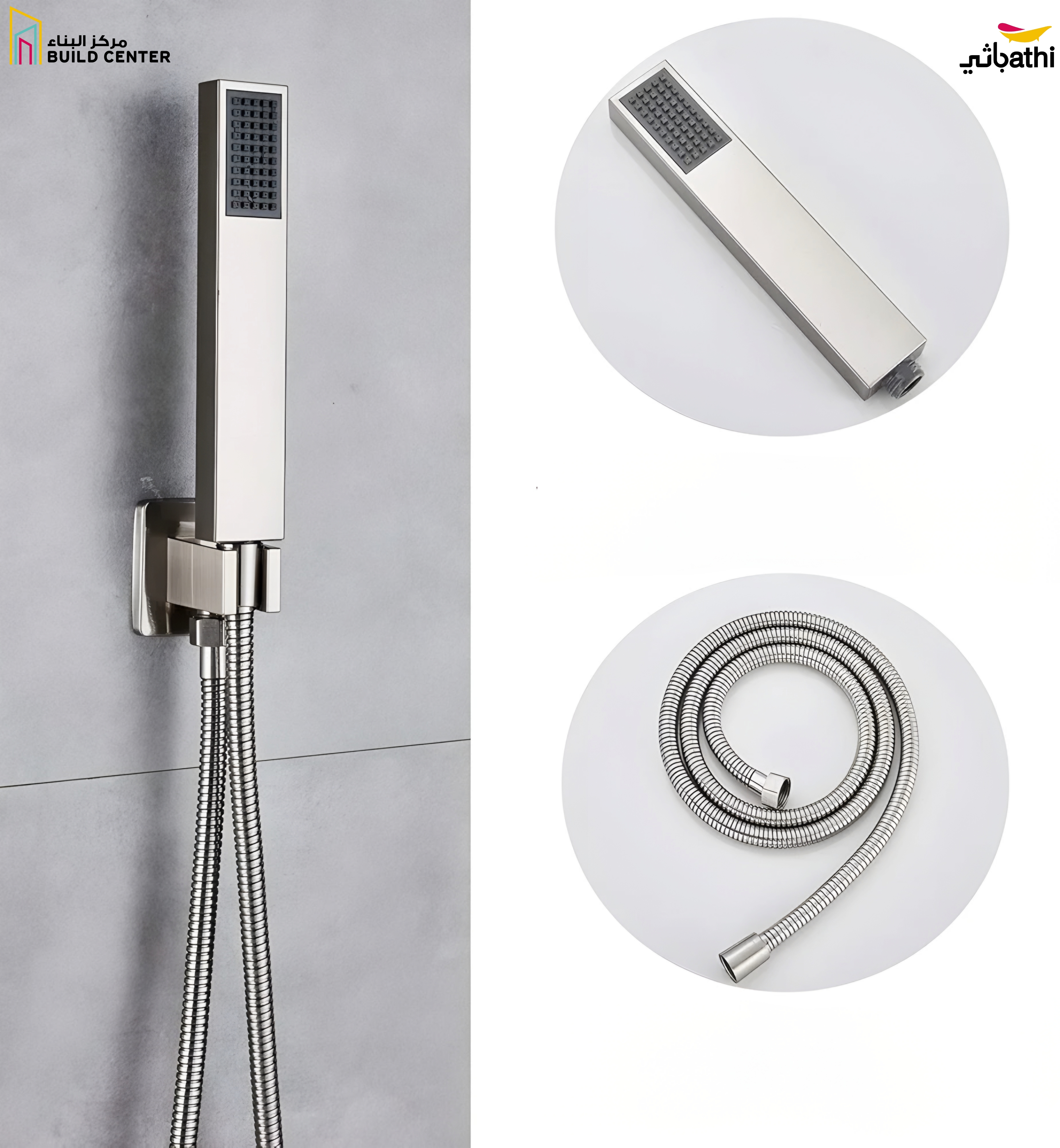- التصميم: رأس دش مربع مع خرطوم مرن وحامل لتثبيت الرأس بسهولة.